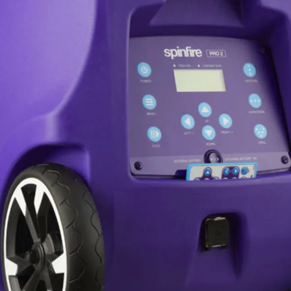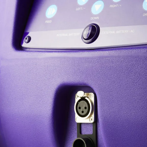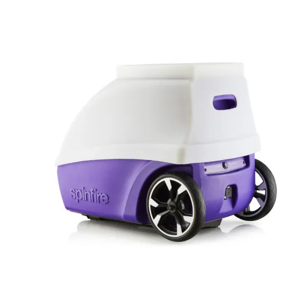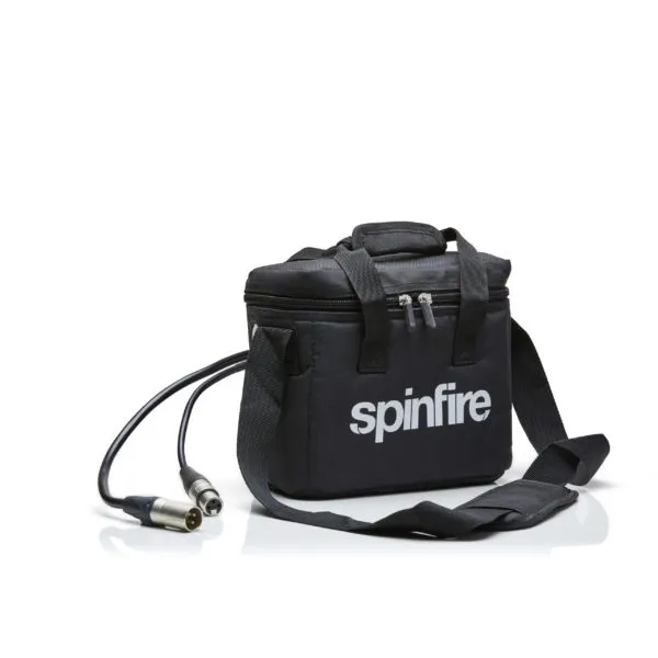 La machine n’a pas de batterie dans sa structure et elle est allégée au maximum (18kg). Elle peut être alimentée avec un Pack batterie externe Spinfire. Cet équipement se présente sous la forme d’une petite valisette en cordura noir avec des poignées et une anse d’épaule contenant une batterie et une connectique permettant de faire fonctionner une machine et de recharger la batterie. Il suffit de poser le Pack batterie à côté du lance-balles et de le brancher à celui-ci lorsqu’on désire jouer.